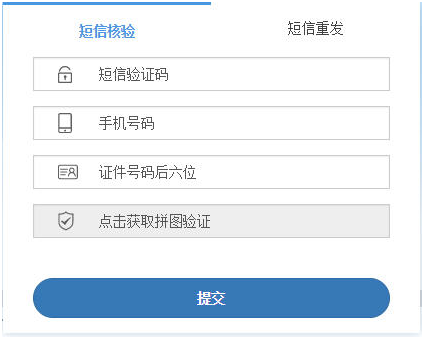 3、填写信息:验证码、手机号码、证件号码后六位数,完成图形验证,再单击“提交 ”。(证件号码后六位指身份证号码)