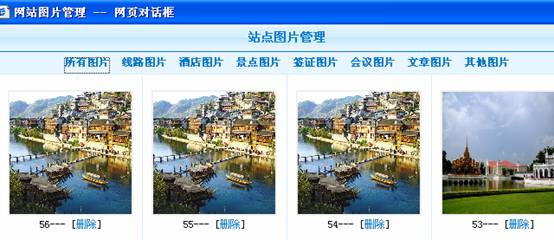 4、 图片库自动调用图片的功能。每个网站后台我们都建立一个图片库,每上传一张图片都可以自动保存到图片库中,并可以对图片库进行更细的分类,如:线路图片、酒店图片、景点图片、签证图片等,如下图: