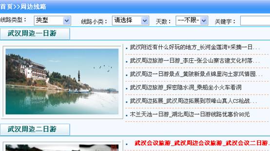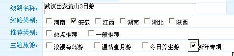 11、添加一个类别的旅游线路,可以同时在其他线路分类里显示。比如添加一条周边旅游线路:武汉出发黄山3日游,可以既在周边游里面显示,同时也可以在安徽旅游页面显示,同时还可以在春节专题里面显示,如图: