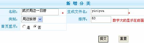 每个版块后台都可以做成自由添加一级子分类,以周边游为例,可以自由添加、修改、删除周边旅游版块下面的子分类,并且可以自由排序,排序值设置的越大越靠前。