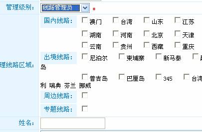 7、 网站后台账号管理功能强大,可以根据客户的要求,开发不同级别的管理级别,如;超级管理员(可以开新的管理账号)、高级管理员(可以维护网站内容,但是不可以再开管理账号)线路管理员,线路管理员只负责维护网站内容,并且可以设置值能维护部分省市的线路和版块,这样可以方便旅行社找合作的旅行社代发布线路,比如武汉东方国旅可以委托海南一家旅行社帮他添加海南的线路,只要给他开通一个海南的线路管理账号就可以了。如下图: