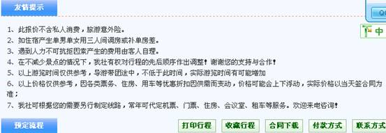 线路终极页面的内容包括:线路名称、门市价、优惠价、天数、出发地、出团日期、联系人、联系电话,线路行程(包括:线路简介、行程安排、服务标准、友情提示)、预定流程。