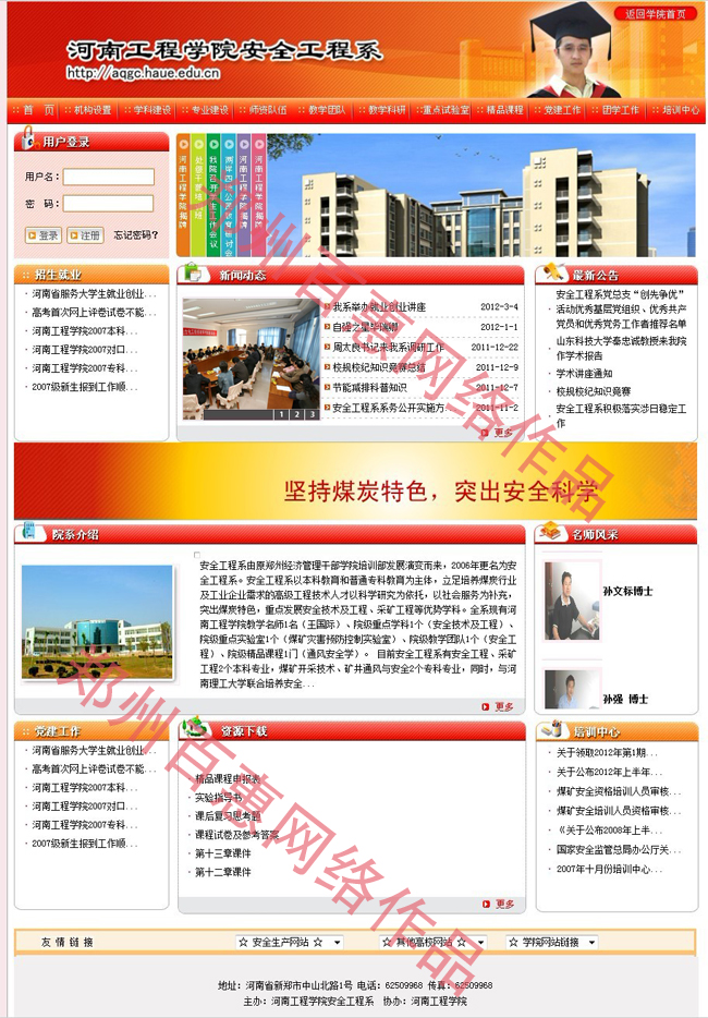 安全工程系由原郑州经济管理干部学院培训部发展演变而来,2006年更名为安全工程系。安全工程系以本科教育和普通专科教育为主体,立足培养煤炭行业及工业企业需求的高级工程技术人才以科学研究为依托,以社会服务为补充,突出煤炭特色,重点发展安全技术及工程、采矿工程等优势学科。全系现有河南工程学院教学名师1名(王国际)、院级重点学科1个(安全技术及工程)、院级重点实验室1个(煤矿灾害预防控制实验室)、院级教学团队1个(安全工程)、院级精品课程1门(通风安全学)。 目前安全工程系有安全工程、采矿工程2个本科专业,煤矿开采技术、矿井通风与安全2个专科专业,同时,与河南理工大学联合培养安全工程、采矿工程硕士研究生。全系现有本专科在校生866人,硕士研究生8人。2011届应届本科毕业生95人,其中专升本40人,考研学生51人,录取30人,研究生录取率达31.6%。安全工程专业被河南省教育厅列为2009年度河南省高等学校特色专业建设点,同年,又被教育部列为第四批高等学校特色专业建设点。 安全工程系现有教职工27人,专职教师24人,专职教师中有教授3人、副教授6人,讲师11人,助教4人;博士7人,硕士14人,研究生学历1人,本科学历2人,研究生以上学历者占专职教师总数的91.7%;国务院特殊津贴专家1人,河南省安全生产专家2人,国家注册安全工程师11人,国家注册安全评价师7人,安全培训教师18人。已形成一支结构合理、层次较高、发展潜力较大的“双师”型师资队伍。 以安全工程系实验中心为依托的“河南工程学院煤矿灾害预防控制实验室”被河南省教育厅列为2009年度河南省高校重点实验室培育基地建设项目。安全工程系实验中心现已建成采矿工程模型室、瓦斯防治实验室、水灾防治实验室、矿山压力与岩层控制实验室、通风安全实验室、安全教育展示室等6个专业实验室。实验中心总面积573平方米,仪器设备总值730余万元。实验中心10万元以上的大型设备有FMB-11/4G型煤尘爆炸演示装置、5E-MAC-III型红外快速工业分析仪、GC-4085型气相色谱仪、WY-98A型自动瓦斯吸附常数测定仪、YD32(A)型多功能电法勘探仪、ZDY1200S型油压钻机、WDW-300型微机控制电子万能试验机、KJ216型煤矿顶板动态(压力)监测系统等,先进的实验设备为教学、科研工作提供了良好条件。 以安全工程系教师为主体的河南工程学院安全技术培训中心作为国家二级煤矿安全培训机构,承担了煤矿生产经营单位主要负责人、安全生产管理人员、带班下井领导的安全培训工作,2008年以来共培训各类煤矿从业人员5800余人次,为河南煤矿的安全生产做出了贡献。 河南工程学院作为河南省安全生产专家委员会(煤矿组)的挂靠单位、河南省煤炭学会理事单位,与河南各大煤业集团公司均具有密切的联系。同时,安全工程系还聘请了一批以中国工程院张铁岗院士、河南省首位特聘教授、博士生导师王兆丰教授为首的国内外知名学者作为兼职教授,为教学、科研工作的快速发展提供了强有力的技术支撑。 安全工程系坚持为煤矿安全服务的办学方向,已经积累了一定规模的教育资源和办学经验。坚持科学发展观,锐意进取,一心一意谋发展,教育质量、科研水平稳步提高,对促进河南煤炭行业的可持续发展做出了积极的贡献,2007年被国家人事部和煤炭工业协会评为“全国煤炭工业先进集体”,2011年4月被河南省煤炭行业协会评为2010年度河南省煤炭行业先进单位。  |