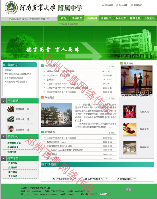 河南农业大学附中办学三十年来,始终坚持德育为首、育人为本的教育思想,注重学生的健康人格培养和全面素质的提高。他们不仅为农业大学的教学科研、改革开放做出了突出贡献,也将为全社会的教育事业贡献了自己的力量。 农大附中自1992年到2007年连续十五年被评为郑州市初中教育教学先进单位。在2005年被评为河南省“道德规范进万家、诚实守信万人行”先进单位,2007年被评为河南省教育系统先进集体。学校党支部曾多次被评为河南农业大学先进党组织,学校被评为河南农业大学思想政治工作先进单位。校工会连续三年被评为河南农业大学先进基层工会,学校52位教师中先后有四位教师被评为全国优秀教师、全国优秀教育工作者,有四位教师被评为河南省优秀教师,先后有二十位教师分别被评为郑州市优秀教师、郑州市优秀班主任、郑州市优秀教育工作者等。近几年来,先后有近百篇教学论文在国家、省市级刊物发表,曾有八位教师参加了全国及省市教学用书的编审工作。有八位老师受省、市教研室的邀请,先后在省、市级教育教学研讨会上做专题报告,在同行和兄弟学校之间产生了积极的影响,受到了专家学者的一致好评。有五位教师被评为省市级学科带头人,有两位教师成为郑州市名师。 2006年,农大附中首批成为郑州市与新加坡初三合作项目的学校,我校先后有六名初三毕业生以优异成绩考取新加坡南华中学,以享受新加坡政府提供的全额奖学金和生活费的形式开始了他们的留学生涯。用他们自己的话说:我们能有今天快乐的学习生活,得益于我们的母校—农大附中的关爱和培养,是那里的老师给予了我们知识和智慧,是那里的老师给我们注入了自信和勇气,也是农大附中的求真精神让我们不知疲倦的去追求真理,去寻求人生的真谛。 农大附中的领导班子工作作风民主,思想作风端正,他们的教师队伍有着极强的凝聚力,干群关系和谐早被社会传为美谈,在几十年的进步与发展中,他们始终目标同向、思想同心、行动同步、没有内耗、努力工作。各种荣誉和奖励,领导退让,向第一线教师和班主任倾斜。老师之间相互尊重、取长补短、学校崇尚团队精神和创新精神、兢兢业业抓教学、一心一意谋发展。 农大附中近几年注重校风、学风、教风的三风建设,抓常规教学和校本教研不放松,教学质量连年上新台阶,每年都有相当比例的初三毕业生输送到郑州一中、外国语中学、实验中学等省级示范性高中。 学校多年来注重学生的发展和习惯培养,中学生守则、日常行为规范、校园常规、课堂常规、学校的奖惩制度是每个学生的入学必修课,通过多种环节让学生懂得如何做一个合格的中学生,学校推崇学校家长社会三位一体的教学思想,推崇赏识教育、注重营造和谐、严格、自觉学习的教育环境,让家长配合学校自觉地承担起教育子女的责任,定期举办的各年级的家长学校。 学校推行开门办学机制,每年都举办家长开放周活动,让家长了解学校的教育教学状况,请他们到班级听课,发放征求意见表,诚恳的听取家长对学校的意见和建议,这项活动也对提高教师的工作责任感和教学质量起了积极的作用。学校为了全面的客观评价老师的教育教学水平,每学期都组织召开学生座谈会,学校联合政教处、教导处、年级长,每学期期中和期末召开以班级为单位的学生座谈会,让学生代表对班主任工作方法、老师的授课、辅导、作业批改、培优补差、关爱学生等方面给予评价。学校再把这些信息汇总分别和老师交流沟通,以达到认识自己、了解学生、完善自己的目的。 学校多年来注重学生素质的提高,开展系列综合实践活动,已成为农大附中的传统教育文化,初一年级“阳春三月的远足活动”以关注大自然、关注环保为主题;初二年级“走进科技馆”参观活动以热爱科学、探求真理为主题;初三年级“走进博物院”和“农大科教园区”的参观活动以感悟华夏文明、关注农业发展为主题。这些多动大大丰富了学生的社会生活,激发了学生的求知欲望,同时也提高了学生的团体协作意识。 学校近几年一直在搞的“语文创新写作”课题的研究,获得了不少成果,结合创新作文研究,学校每年举行全校性的读书报告活动。学校号召全体师生走进文学经典、品味美丽人生,让中国的灿烂文化滋养孕育每个人的心田。每班推荐代表写出读书心得,对全校演讲,并将优秀作品汇集成册。这项活动大大激发了师生爱书、读书的自觉行为,也激励了师生弘扬中国的传统文化的思乡情怀,使我们的学生成为一个会读书、爱读书的人。 总之,农大附中几年来秉承为人民办学的理念,求真务实,不断进取,教学教育质量连年迈上新台阶,在社会上的知名度不断提高。我们坚信社会各界的关爱支持,必将会给农大附中注入新的生机活力。  |