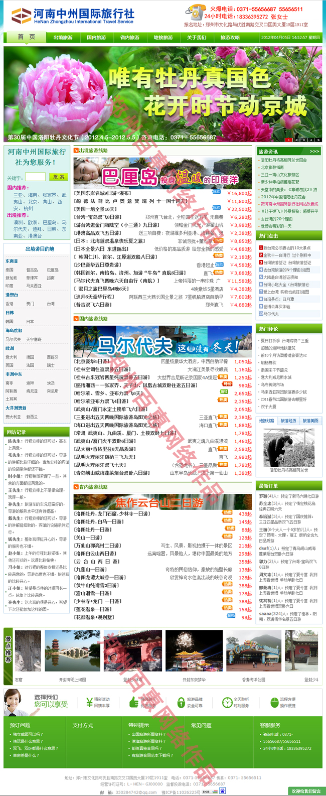 河南中州国际旅行社有限公司(简称中州国旅)隶属于中州国际集团,是经国家旅游局批准、具有特许经营出境组团资格的旅行社。成立 10 年来,组织中国公民国内旅游和出境旅游,招徕和接待外国旅游者、华侨、港澳台同胞来国内旅游观光、探亲访友、商务考察等业务量位居全省前列,是目前河南省实力最强的旅行社之一。 中州国旅在发展壮大中,依托母公司“人才、资本、管理、品牌”的实力和与世界顶级酒店集团——英国洲际、法国雅高长期合作的优势,一年一个大台阶的向前发展。公司随着连年业务量的大幅攀升,组织机构不断增加和完善,大量专业人才聚集,目前拥有韩国部、欧美部、国内一部、国内二部、国内三部、国内四部、出境中心、入境中心、假日部、航空票务部以及 20 家门市、 2 家分社,以及车务服务等业务部门,以五星品质满足国内外宾客旅游、商务考察、大型会议接待、探亲、自助旅游等项目的服务。目前,业务网络也有省会郑州延伸到了河南各地市,并与国内外 200 多家旅行社保持业务联系和长期友好协作关系。常年组织东南亚、韩国、日本等包机旅游,多次获得省市出入境包机现金重奖。 2009 年,公司成为河南首批被国家旅游局批准具有赴台旅游组团资格的六家旅行社之一。 集团主要从事招徕和接待境外旅游者来华观光,组织中国公民境内旅游,承办各种会议、展览,安排商务考察、学术交流、探险、文化教育、体育比赛、文艺演出等专项活动。旅行社内设:日韩部、欧美部、亚大部、国内部、海外部。 中州国旅在未来发展中,在广大旅游者的关心支持下,全体员工满怀信心,奋发努力,广开渠道,诚实守信,永远成为国内外旅游者更加信赖的朋友和合作伙伴。 旅游网站首页效果展示  |