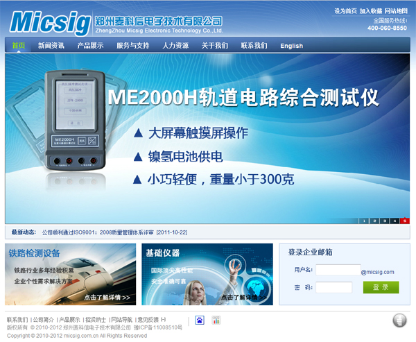 郑州麦科信电子技术有限公司成立于2004年,是专业从事测量仪器仪表、特殊领域电子设备的研发、生产、销售及服务的高新技术企业。公司先后获得了ISO9001:2008质量管理体系认证、CMC认证、铁道部行政许可及铁路专用计量器具生产许可。 公司一直坚持“自主创新,敢于竞争,人才至上,着眼未来”的发展战略,坚守为用户提供 “高质量、高性能、高技术含量” 产品的发展方向,致力于把“Micsig”打造成业界品质卓越的高端品牌。 公司拥有实力雄厚的研发团队,中高级研发人员50余人,其中研究生及以上学历占研发人员总数的60%左右。公司所有产品具有完全自主知识产权,现有各项专利共17项。公司最新研制的手持式多功能示波器以无与伦比的高刷新率、全隔离的双通道信号测量、方便的串行总线分析等卓越性能,成为手持示波器领域的佼佼者。 公司专为铁路研制的信号故障分析系统、轨道参数测量装置、列控中心数据记录单元,都拥有较高的技术含量和技术难度,全部填补了行业空白,在现有的高速铁路及普通铁路上被广泛应用,为中国高铁建设做出了积极的贡献。 郑州麦科信电子技术有限公司网站首页效果图:  网站地址:http://www.micsig.com.cn |