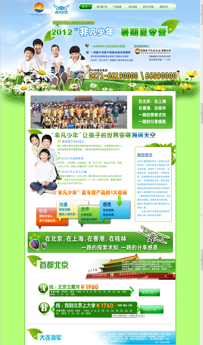在这个暑假里给孩子一段独立生活的时间,让他们离开父母视线下的生活环境,到另外一个环境中。去体验生活、去感受自然、去探索未 知。这些有意思的活动会达到锻炼自己、开阔眼界的目的,相信这些奇妙的经历带给孩子的很多快乐,相信这些丰富多彩的营队生活留给 童年一些试图努力长大的美好回忆。 暑假对孩子的真正意义是:没有课堂的束缚,在属于自己空间里, 随时从家里都可以到外面海阔天空的跑一圈。 让每个孩子在这段珍贵的时间里像小树一样向阳光舒展! 夏令营的意义:青少年夏令营活动是实施素质教育的有效途径。它是提高未成年人思想道德教育的重要渠道,它是学校教教育和家庭教育的良好补充。 品牌介绍:年风雨,十年拼搏,迎来彩虹。使“非凡少年”的主打产品;我到北京上大学,我到上海看世界”去得了骄人的成绩。 非凡少年之非凡力量:河南省中国旅行社《非凡少年》夏令营活动在河南正在热火朝天的进行。在处于活动中年龄段在(7-17岁)的孩子当中,暑假的夏令营几乎成了孩子们的节日。  河南省中国旅行社成立于1991年,原隶属于河南省人民政府外事侨务办公室。 2009年,为响应国家有关政策,改制更名为河南省中国旅行社有限公司,地址迁至于郑州市郑东新区商务外环路14号19层1901-1918室。是经国家旅游局批准的国际旅行社、中国公民出境旅游组团社之一,河南首批“诚信旅游示范窗口”单位、河南省首批4A级旅行社。在河南郑州及河南部分直辖市均设有分支机构,目前旗下拥有七大中心:管理中心、公民中心、操作中心、旅游接待中心、企业发展中心、门市管理中心、分公司管理中心;45个部门及分支机构,三家投资运营的河南省中允会议服务有限责任公司、河南省中盛餐饮有限公司、河南郑东旅游开发有限公司。主要从事招徕接待华侨华人、港澳台同胞和外国游客;组织中国公民赴港澳台、出国旅游,编排国内外旅游线路及安排旅游活动;承办各种会议旅游、业务培训;提供旅游咨询、***港澳签证和护照、代订机票、客房等多种服务。河南省中国旅行社有限公司凭借雄厚的实力、快捷的效率、优质的服务和良好的信誉得到了广大旅游者及同行的赞扬与信赖,多次荣获“全国国际旅行社综合实力百强”,河南省“十佳旅行社”,“消费者信得过旅行社”等荣誉。2008年7月,我社荣获河南省旅游系统“先进集团”称号,2008年12月份,我社荣获河南省“四星级旅行社”。 旅游是艺术,旅游是文化,旅游是高品味的生活方式;同样是旅游中旅更完美,同样是服务中旅更周到,同样是报价中旅更合理。 与中旅同行,让快乐相伴! 网址:http://www.hnctsly.com/s/2012xly/ 效果图:  |